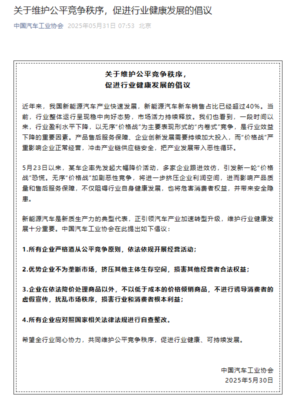 随着争夺更加激烈,市场竞争也明显进入无序状态。因此,我们这次也看到一整套“叫停”的组合拳打出:中汽协及时发布《倡议》,工信部相关负责人第一时间回应。